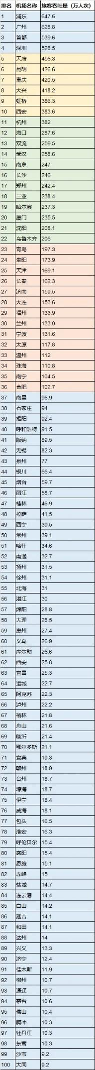 福州和兰州旅客吞吐量均为 133.9万人次 ,二者在排名上的竞争较为激烈;