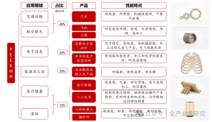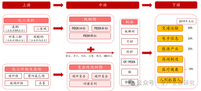 PEEK属于合成树脂制造行业,上游是化学原料和化学纤维制造行业(氟酮是最关键原材料),下游应用于交通运输、航空航天、电子信息、能源及工业、医疗健康等行业,PEEK产业链如下图所示