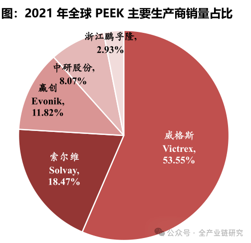 2021年全球PEEK销量7716.8吨,其中威格斯占比54%(半壁江山)、索尔维占比18%、赢创占比12%,海外3家龙头CR3=84%、格局高度集中。