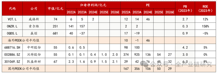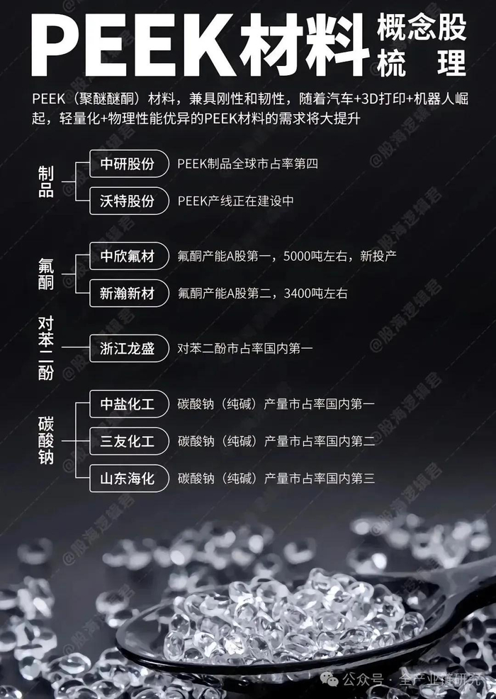 2)国内企业:中研股份(国内龙头,现有产能1000吨产能);沃特股份(规划建设(PEKK+PEEK)产能1000吨产能);凯盛新材(国内PEKK龙头,现有产能1000吨产能)、鹏孚隆(已商业化生产多系列PEEK树脂及改性产品)等。