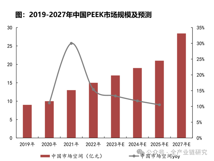 2024年中国PEEK市场规模为19亿元,2027年将达28.4亿元。22-27年中国市场空间CAGR=13.7%。