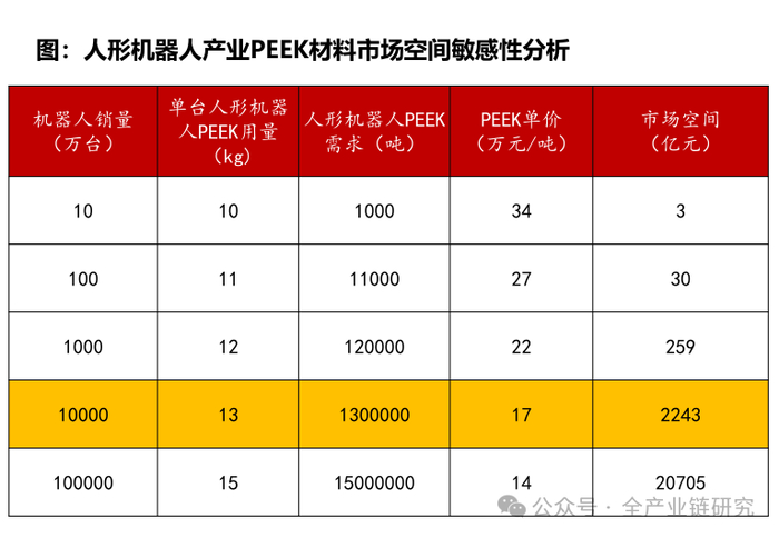 2、单台机器人PEEK用量:假设未来随着人形机器人的放量,持续提升,10~15公斤。主要用于骨架、轴承和齿轮等。