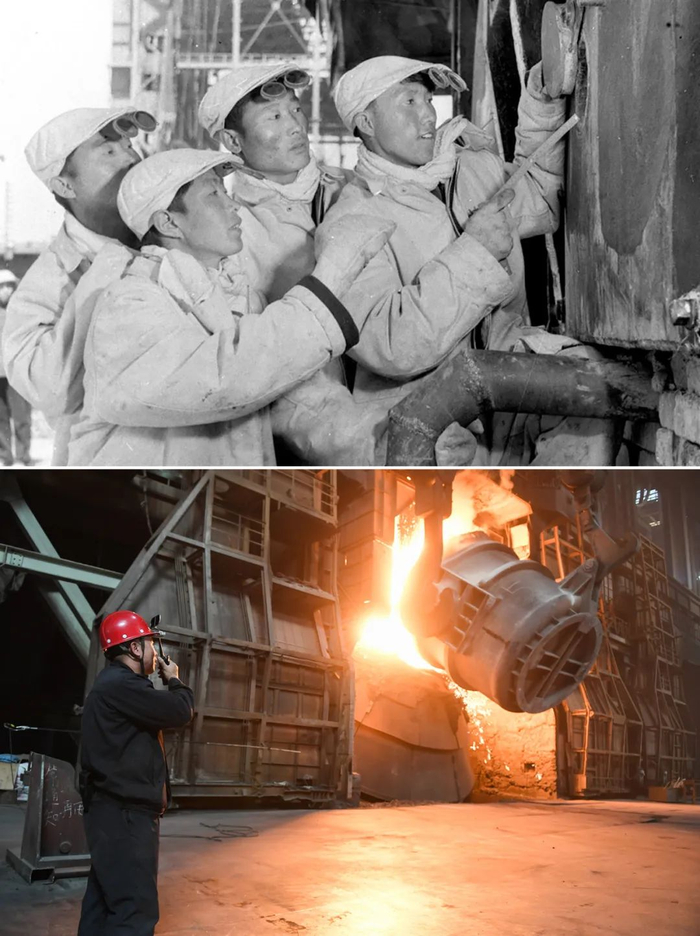 ▲上图为1960年,负责内蒙古包钢一号大平炉开炉生产的炼钢工人们在观察炉温上升情况。新华社发 崔晓华摄 下图为2019年6月4日,内蒙古包头钢铁(集团)有限责任公司转炉总工长刘铭在转炉炼钢现场用对讲机指挥操作。新华社记者 刘磊摄