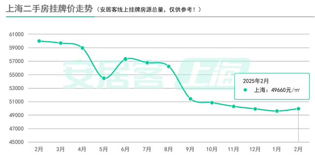 另据安居客平台数据,2月,上海二手房挂牌均价(仅安居客)为49660元/平方米,1月二手房挂牌均价(仅安居客)为49610元/平方米,环比上涨0.1%,这是自2024年6月连续七个月下跌后的首次上涨。