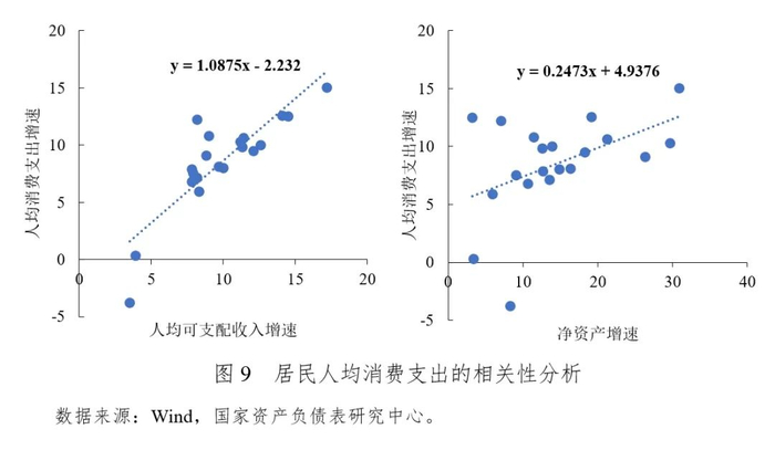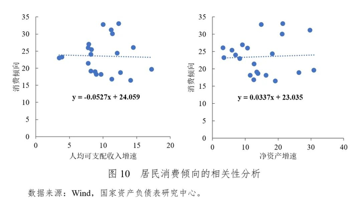 一个值得思考的现象是,收入流量和财富存量对居民消费意愿和能力的边际影响存在差异。我们对2002-2022年居民人均可支配收入增速(流量视角)、净资产增速(存量视角)与居民人均消费支出增速(反映消费能力)、消费倾向(反映消费意愿)进行相关性分析,结果显示:其一,与居民净资产增加相比,人均可支配收入增长对消费支出的正向影响更大(见图9)。这说明促进居民收入增长是提升消费能力的直接有效途径,而财富积累通过改善收入预期间接提振居民消费,边际影响相应减弱。