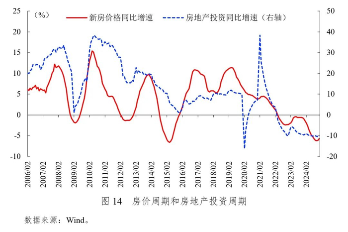 2006-2016年,房价周期和房地产投资周期呈现3年左右一个小周期特征,房地产投资周期滞后于房价周期约1个季度至半年(见图14)。房价回暖向房地产投资增长的传导速度主要取决于房企拿地意愿和开发能力,考虑到房企债务违约风险尚未完全出清,需通过减少拿地和新开工项目来稳定现金流,因此房地产投资降幅短期内难以收窄。此外,2025年房企债券到期规模达5257亿元,较2024年偿债压力进一步加大(2024年房企债券到期规模为4828亿元)。在新房销售尚未止跌企稳以及资产处置难度较大的情况下,房企偿债压力上升可能导致房地产投资周期相较于房价周期的滞后性进一步被拉长。