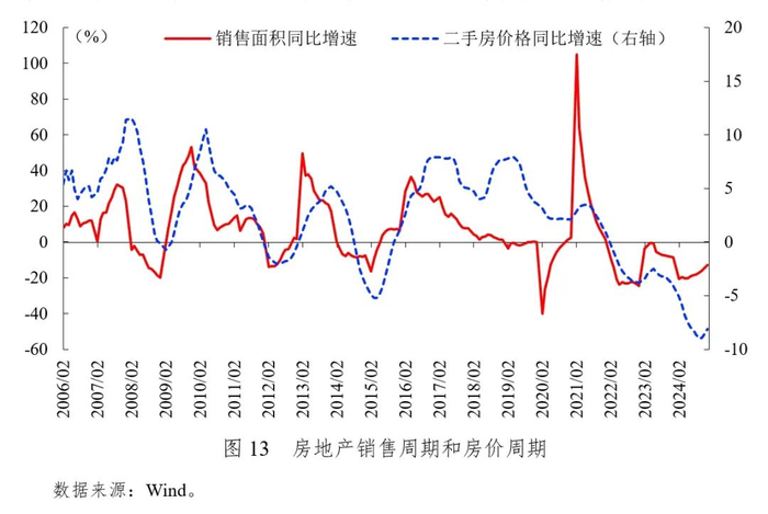 2006-2016年,房地产销售周期和房价周期呈现3年左右一个小周期特征,销售周期领先于房价周期约1个季度(见图13)。主要原因是商品房销量变化能即时反映当前房地产市场供需关系,而房价止跌回稳往往需要等待市场信心修复才能迎来实质性拐点。若将商品房销售面积增速视为房价变化的先行指标,2024年四季度以来,商品房销量回升对房价降幅收窄形成一定支撑,房地产市场出现量增价稳的积极变化。从成交量看,四季度全国新建商品房销售面积、销售额分别同比增长0.6%和1.2%,扭转了之前持续下滑的态势。居民购房需求回升带动二手房价格连续四个月降幅收窄,一线城市房价止跌回稳趋势明显。2025年1月,一线城市二手房价格同比降幅为-5.6%,较上月收窄1.1个百分点。