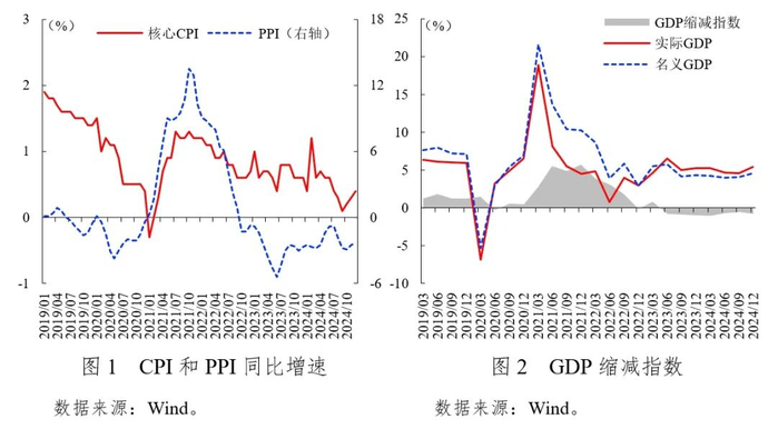 从增长动能看,供给恢复快于需求,物价延续低位运行。一揽子增量政策推出后,市场预期有效提振,经济景气度明显回升,四季度制造业PMI指数持续处于50%以上扩张区间。随着消费品以旧换新加力扩围和房地产市场边际回暖,四季度核心CPI同比增速稳步回升,工业品需求逐步恢复带动PPI同比降幅收窄(见图1)。通缩压力对名义经济增长的拖累效应依然存在,GDP缩减指数自2023年二季度起连续七个季度为负(见图2)。