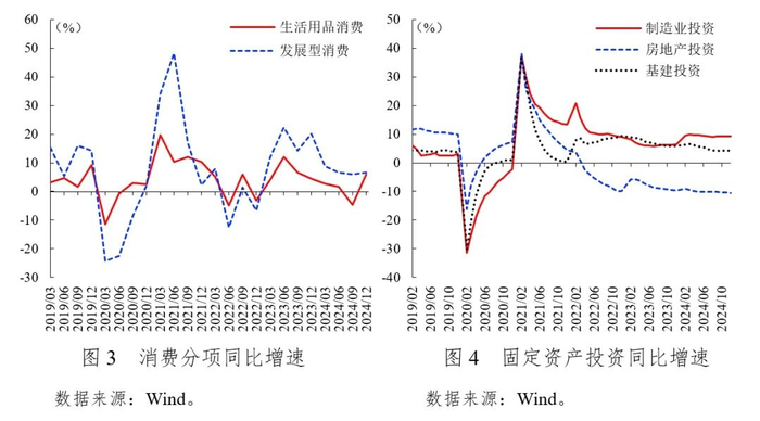有效需求不足仍是经济复苏的主要掣肘。从消费端看,以旧换新政策提振耐用品消费,发展型消费增长放缓。自2024年9月起,各地通过扩大支持范围、加大补贴力度、简化申请流程,加快推动消费品以旧换新政策落地见效,家用电器和音像器材类商品零售额连续四个月保持20%以上的高增长。尽管耐用品消费明显改善,但由于居民收入预期不稳和资产价值缩水,医疗保健、教育文化娱乐服务等发展型消费增长放缓(见图3)。从投资端看,制造业投资韧性较强,房地产投资降幅继续扩大。得益于出口超预期增长和大规模设备更新政策,制造业投资保持9%以上的稳健增长。受地方财政紧平衡和化债压力影响,2024年狭义基建投资(不含电力)同比增长4.4%,较去年放缓1.5个百分点。四季度房地产销售量价出现积极变化,但销售端边际回暖尚未传导至投资端,房地产投资降幅扩大至-10.6%(见图4)。