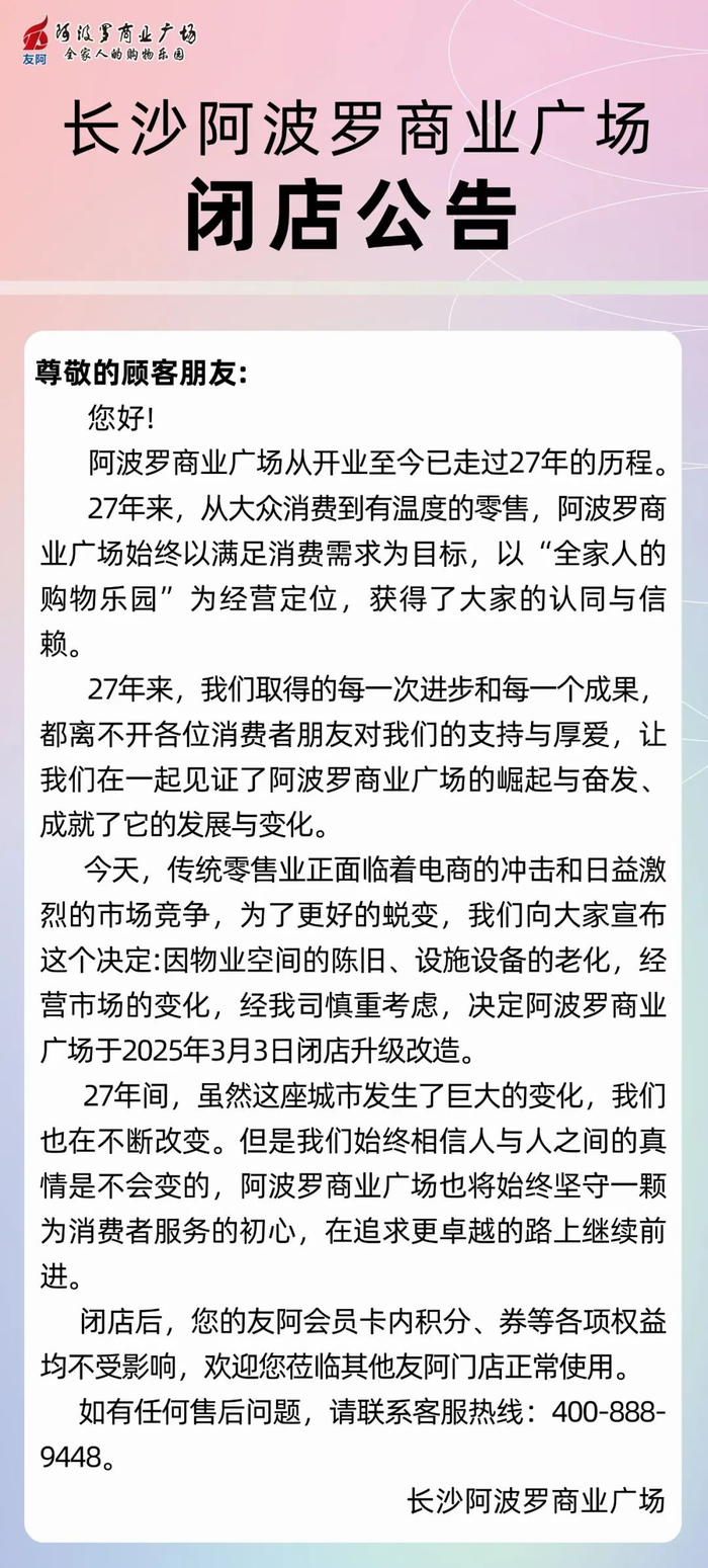 “27年间,虽然这座城市发生了巨大的变化,我们也在不断改变。但是我们始终相信人与人之间的真情是不会变的,阿波罗商业广场也将始终坚守一颗为消费者服务的初心,在追求更卓越的路上继续前进。”公告表示,闭店后消费者持有的友阿会员卡内积分、券等各项权益不受影响,可前往其他友阿门店正常使用。若消费者有任何售后问题,可拨打客服热线 400-8889448进行咨询。