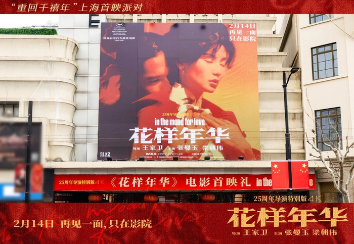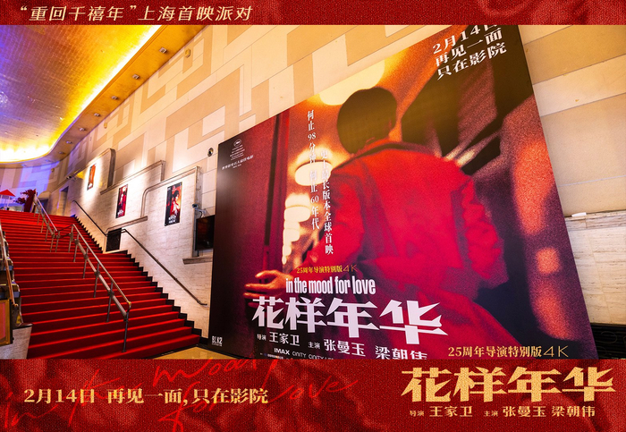 今年情人节,《花样年华》25周年导演特别版在院线重映,虚拟照进了现实。相爱的人必须在现实中见面,一如官方公布的宣传片里,也赫然写着“2月14日,只在影院”。提前两日的上海首映礼当天,《繁花》剧组也来到了现场,阿宝和汪小姐并肩而立,消融了“人生如戏、戏如人生”的边界——这是王家卫惯常使用的魔法,他喜欢让角色在不同影片间穿梭游走,制造幻觉。