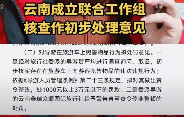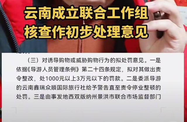 (三)对诱导购物或威胁购物行为的拟处罚意见。一是依据《导游人员管理条例》第二十四条规定,拟对其做出责令整改,处1000元以上3万元以下的罚款。二是委派导游的云南鑫瑞众顺国际旅行社给予警告直至责令停业整顿的处罚。三是由事发地西双版纳州景洪市联合市场监督部门对涉事购物场所进行依法查处和停业整顿。
