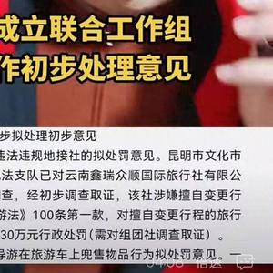 (一)对违法违规地接社的拟处罚意见。昆明市文化市场综合行政执法支队已对云南鑫瑞众顺国际旅行社有限公司进行立案调查,经初步调查取证,该社涉嫌擅自变更行程;依据《旅游法》100条第一款,对擅自变更行程的旅行社作出罚款3-30万元行政处罚(需对组团社调查取证)。