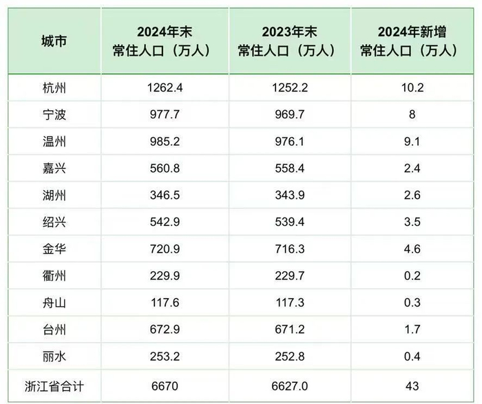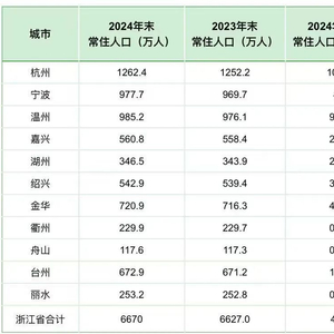 同时,杭州、温州、宁波2024年的常住人口增量,合计达到27.3万人,占全省新增常住人口规模的比重接近三分之二。