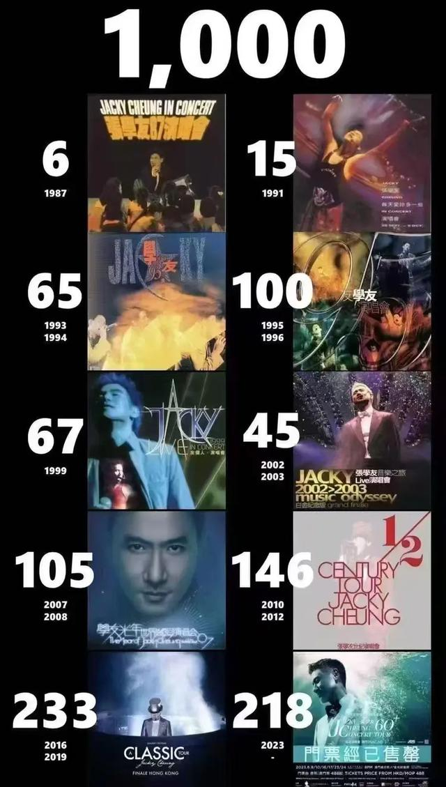 最后,附上一张详实的图表,清晰展现张学友 1000 场演唱会的达成之路。如今,60 + 演唱会第二轮返场火热开启,歌迷们满怀期待,盼望着他能向着 300 场的宏伟目标奋勇迈进。在演唱会场次这一领域,张学友已然筑起一座难以逾越的高峰,不愧是华语乐坛永恒的“歌神”。