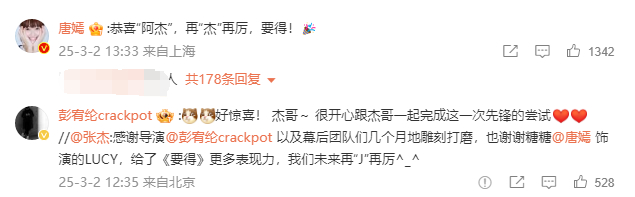 张杰转发工作室动态表示:“感谢导演彭宥纶以及幕后团队们几个月地雕刻打磨,也谢谢糖糖唐嫣饰演的LUCY,给了《要得》更多表现力,我们未来再‘J’再厉。”