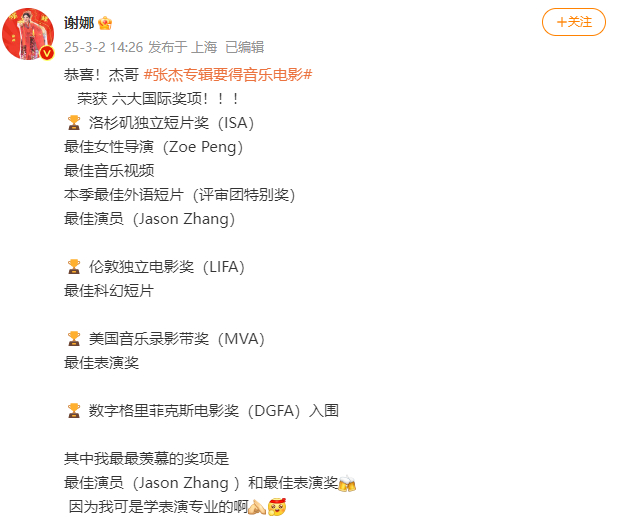 张杰妻子谢娜也发文恭喜丈夫获奖,并称:“我最最羡慕的奖项是最佳演员(Jason Zhang )和最佳表演奖, 因为我可是学表演专业的啊。”