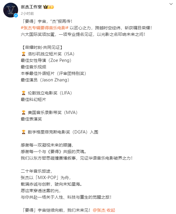 张杰工作室称:“六大国际奖项加冕,一项专业提名见证,以光影之名叩响未来之问!感谢每一双凝视未来的眼睛,感谢每一个与《要得》共振的灵魂。我们以东方哲思碰撞赛博叙事,见证华语音乐电影破界之力!”