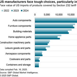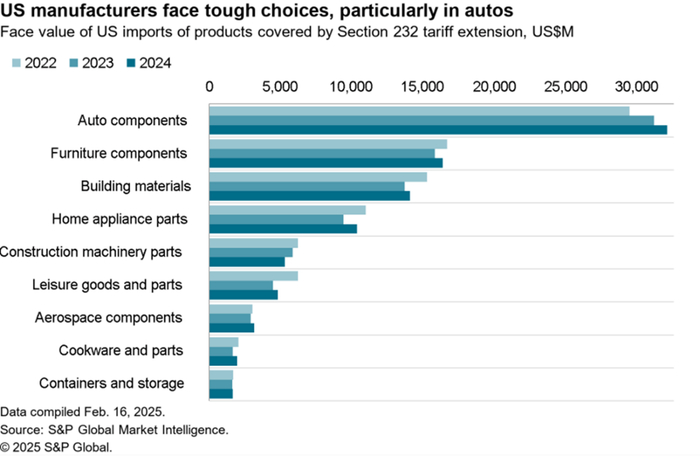 标普全球市场财智对此做出的研究显示,美国政府扩大对钢铁和铝征收232条款关税的范围,包括的衍生产品比之前预期的要多;就行业而言,重点是制造业零部件,包括价值在320亿美元左右的汽车零部件。其他面临额外成本的行业包括住宅建筑材料、家具和家用电器。而为减少关税负担而增加更多的美国材料含量,这会使供应链复杂化并增加成本,供应商可能会在短期内提高价格以弥补损失。