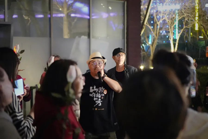 晚上7:00,演唱会开始,场内不断升温,场外,没抢到票的“刀迷”们也聚集在黄浦江边的世博公园一角,在各自的直播间里开启了他们自己的演唱会。一位长相酷似刀郎的人,正唱着刀郎的《情人》,旁边一群人挥舞着手中的玫瑰花,唱着跳着,没抢到票也很开心。不远处,另一群“刀迷”手中摇晃着灯牌,合唱起《驼铃》。在他们热情的歌声里,世博公园、黄浦江、卢浦大桥的美景,也通过一个个直播间,唤起更多人对这座城市的向往。