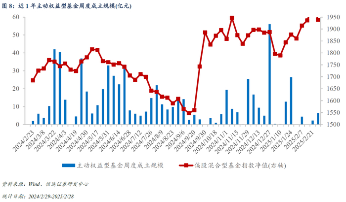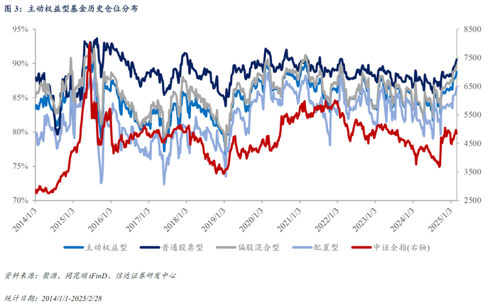 至2025/2/28,主动权益型基金的平均仓位约为88.76%。其中,普通股票型基金的平均仓位约为90.58%(较上周上升0.37pct),偏股混合型基金的平均仓位约为89.67%(较上周上升0.43pct),配置型基金的平均仓位约为86.52%(较上周上升0.65pct);“固收+”基金平均仓位约为23.93%,较上周上升1.08pct