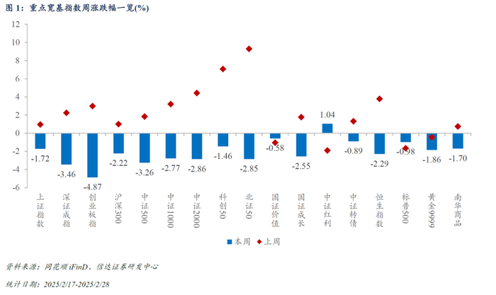 宽基指数表现回顾:本周(2025/2/24-2025/2/28)A股宽基指数普遍下跌,红利风格整体有所修复。截至2025/2/28,上证指数报收3320.9点,周涨跌幅约-1.72%;深证成指报收10611.24点,周涨跌幅约-3.46%;创业板指报收2170.39点,周涨跌幅约-4.87%;沪深300报收3890.05点,周涨跌幅约-2.22%。