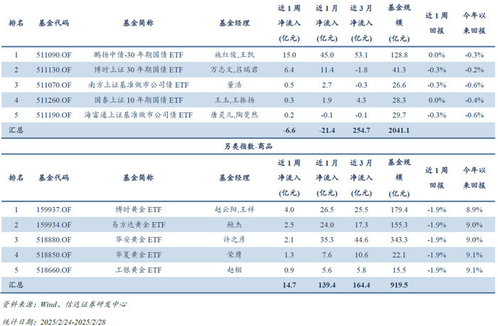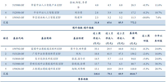ETF资金流向:2月出现千亿级净流出。避险资产和热点主题受青睐:(1)黄金类ETF强势吸金:SGE黄金9999相关ETF单月净流入超122亿元,上海金相关ETF净流入超17亿元,避险情绪升温。(2)热点主题ETF受捧:机器人、CS人工智、港股创新药、云计算、港股通互联网、科创AI等指数相关ETF资金相对较多,资金相对追逐AI和创新药主线。(3)其他配置需求:证券公司、中债-30年期国债财富(总值)指数、光伏产业、纳斯达克100、标普港股通低波红利指数、中证全指电力指数等亦获资金增配。宽基指数和港股科技相对承压,科创50、沪深300、中证A500、中证500、恒生互联网科技业、中国互联网50等指数净流出较多。
