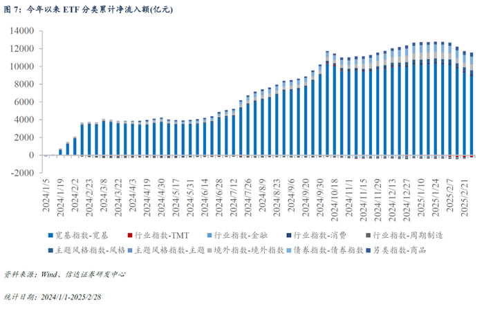 本周(2025/2/24-2025/2/28),境内股票ETF资金合计净流出约187.51亿元,合计规模为28612.41亿元;跨境ETF合计净流入约146.57亿元,合计规模为4644.74亿元;债券ETF合计净流出约6.62亿元,合计规模为2041.09亿元;商品ETF合计净流入约14.74亿元,合计规模为919.54亿元