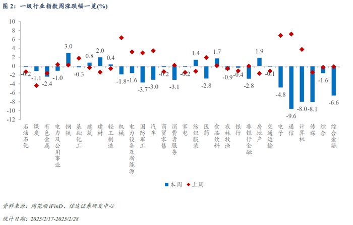 行业指数表现回顾:本周(2025/2/24-2025/2/28)一级行业跌多涨少,钢铁、建筑涨幅靠前,通信、传媒、计算机领跌。周涨跌幅排名居前的行业有钢铁、建材、房地产、食品饮料、纺织服装等,收益率依次为2.96%、1.98%、1.86%、1.74%、1.44%;周涨跌幅排名靠后的行业包括通信、传媒、计算机、综合金融、电子等,收益率依次为-9.62%、-8.06%、-8.01%、-6.60%、-4.79%