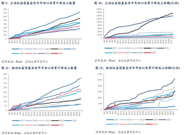 本周境内新成立基金数目共计31只,其中主动权益型基金3只;主动权益型基金新发总份额约为6.46亿份,为近1年41.1%分位。今年以来主动权益型基金新发26只,规模合计约52.89亿元,约为去年同期水平的48%;被动权益型基金新发75只,规模合计约518.71亿元,合计发行规模远超去年同期