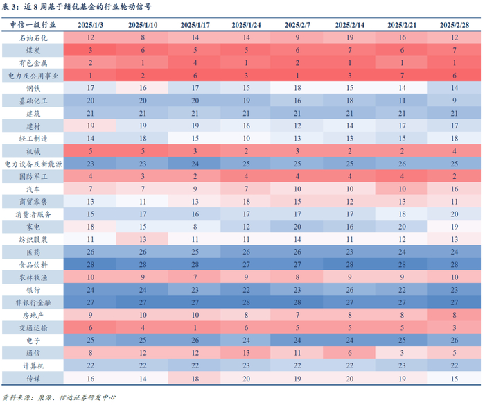 基于绩优基金持仓倾向的边际变化,我们研发了相应行业轮动模型并予以及时跟踪。本周绩优基金超配的行业包括有色金属、国防军工、交通运输、机械、通信、电力及公用事业等,依旧维持在红利风格上的较高暴露度;低配的行业包括食品饮料、非银行金融、电子、电力设备及新能源、医药、银行等,绩优基金整体对于当前机构重仓行业仍维持谨慎判断