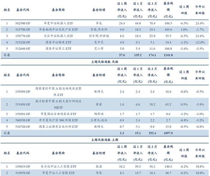 风格主题ETF方面,本周资金净流入约33.04亿元,合计规模为5009.36亿元。其中,风格ETF净流入1.29亿元,合计规模为1096.99亿元;主题ETF净流入31.75亿元,合计规模为772.24亿元。本周净流入相对较多的产品包括国泰富时中国A股自由现金流聚焦ETF、易方达中证人工智能ETF