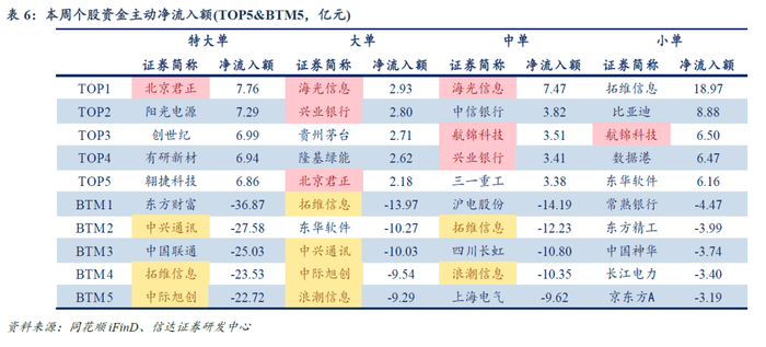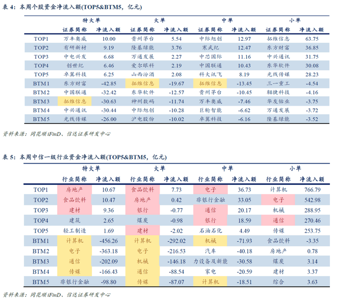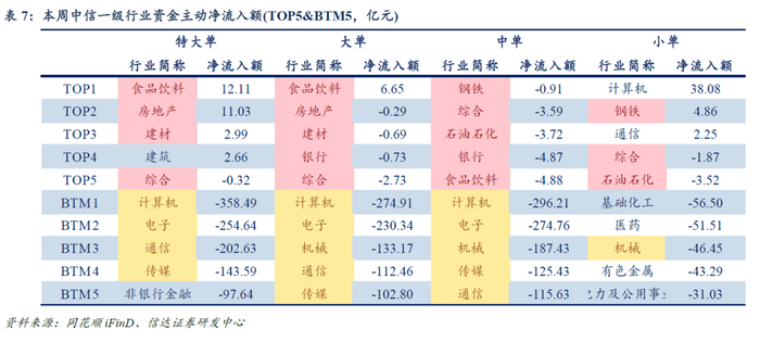 主力主动资金大幅流出TMT。主力资金流:本周主力流出TMT。(1)个股:主力净流入&中小单净流出:贵州茅台、有研新材、中电兴发、万马股份、中材科技等。主力净流出&中小单净流入:拓维信息、东方财富、中兴通讯、中际旭创、光线传媒等。(2)行业:主力净流入&中小单净流出:食品饮料、房地产、建材等。主力净流出&中小单净流入:计算机、电子、通信、传媒、机械等。主动资金流:本周主买净额约-5111.67亿元,主动资金净流出TMT。(1)个股:主动资金更看好北京君正、海光信息、航锦科技、翱捷科技、阳光电源等标的,东方财富、中兴通讯、浪潮信息、沪电股份、拓维信息等标的遭主动资金净卖出。(2)行业:主买净额居前的行业有:食品饮料等;流出较多的行业有:计算机、电子、机械、通信、传媒等。