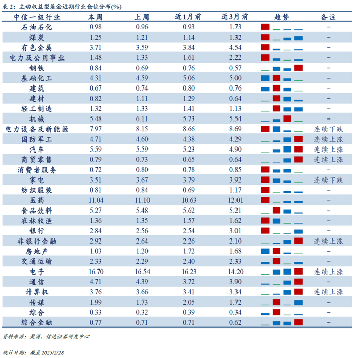 至2025/2/28,主动偏股型基金大盘成长仓位17.37%(较上周下降0.3pct),大盘价值仓位10.69%(较上周上升1.25pct),中盘成长仓位11.2%(较上周下降3.09pct),中盘价值仓位11.43%(较上周上升0.3pct),小盘成长仓位44.67%(较上周上升3.04pct),小盘价值仓位4.64%(较上周下降1.21pct)