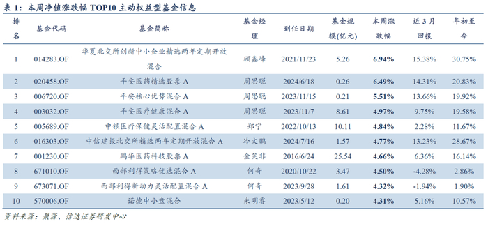 本周主动偏股型基金的净值涨跌幅平均值-2.77%,上涨基金数目占比9.30%。其中:净值表现最好的前五只基金分别是华夏北交所创新中小企业精选两年定期开放混合、平安医药精选股票A、平安核心优势混合A、平安医疗健康混合A、中银医疗保健灵活配置混合A,一周净值涨跌幅分别是6.94%、6.49%、5.51%、4.97%、4.84%