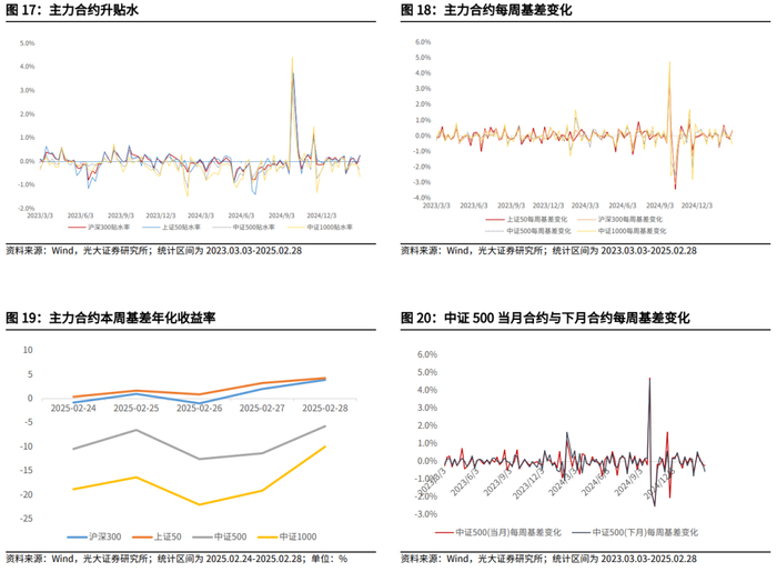 本周沪深300、上证50指数期货主力合约贴水率环比上一交易周上升,中证500、中证1000指数期货主力合约贴水率环比上一交易周下降。IF当月合约近一季度平均每周基差变化0.03%,相比于近半年的0.02%环境变差。IH当月合约近一季度平均每周基差变化0.01%,相比于近半年的0.01%环境不变。IC当月合约近一季度平均每周基差变化0.03%,相比于近半年的0.00%环境变差。