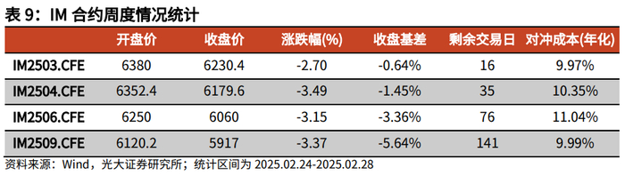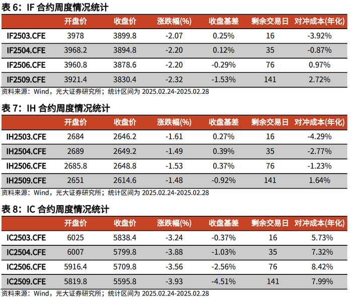 本周IF当月合约下跌2.07%,收于3899.8,收盘基差0.25%;IH当月合约下跌1.61%,收于2646.2,收盘基差0.27%;IC当月合约下跌3.24%,收于5838.4,收盘基差-0.37%;IM当月合约下跌2.70%,收于6230.4,收盘基差-0.64%。