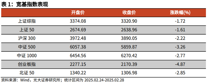 本周(2025.02.24-2025.02.28,下同)A股市场呈现剧烈波动,周度涨跌来看,主要宽基指数悉数下跌,创业板指领跌。行业表现方面,计算机、通信、传媒振幅居前。资金面方面,ETF资金整体净流出,宽基ETF为净流出主力。