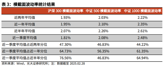 时间序列上来看,最近一周沪深300、中证500指数成分股时间序列波动率环比上周下降,Alpha环境减弱;中证1000指数成分股时间序列波动率环比上周上升,Alpha环境好转。近一个季度看,沪深300、中证1000指数波动率处于近半年中上分位点,Alpha环境较好;中证500指数波动率处于近半年中下分位点,Alpha环境较差。