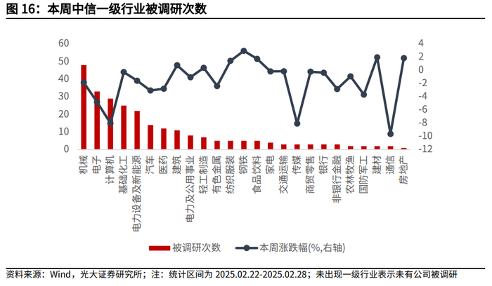 从中信一级行业来看,本周机械、电子和计算机行业被调研次数较多,本周涨跌幅依次为-1.84%、-4.79%和-8.01%。