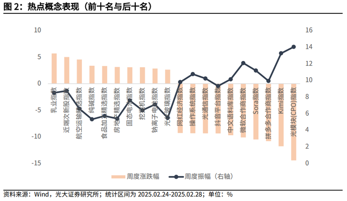 从热点概念来看,本周概念指数中表现最好的前5大概念依次为乳业指数、近端次新股指数、航空运输精选指数、纯碱指数、食品加工精选指数;表现最差的5大概念依次为光模块(CPO)指数、Kimi指数、拼多多合作商指数、Sora指数、微软合作商指数。
