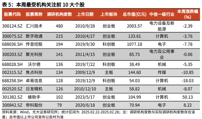 从个股来看,本周受到机构关注程度最高的前5大个股依次为汇川技术(480家)、数字政通(215家)、传音控股(194家)、聚光科技(141家)和沃尔德(136家)。