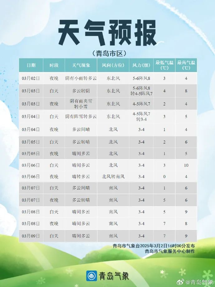 【青岛市区】今天夜间,阴有小雨转多云,东北风5到6级阵风8级,明天白天,多云转阴,东北风5到6级阵风8级转4到5级阵风7级,相对湿度60%-100%,明天最低气温3℃,最高气温8℃。