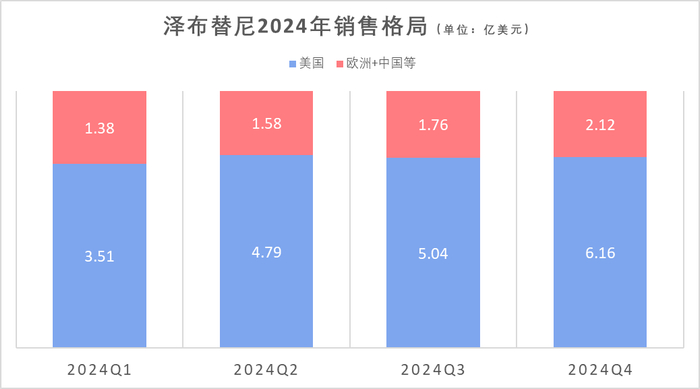 2024年,泽布替尼在美国的销售额增长了106%,达到19.5亿美元,占据百济神州营收的一半,逐季度的增速平均是20%;欧洲约到美国市场的五分之一。