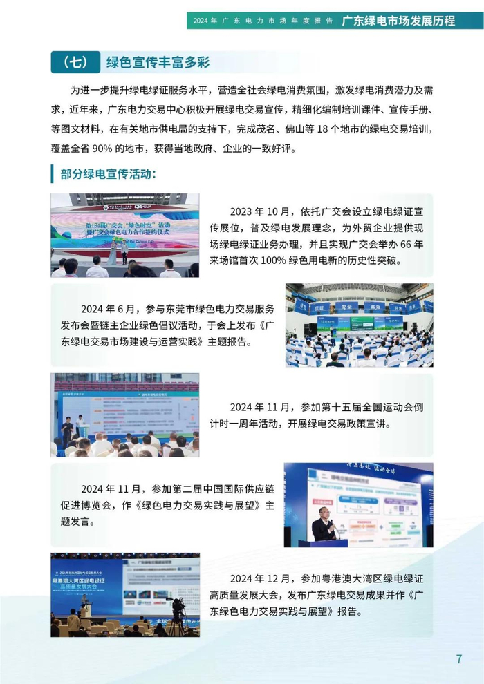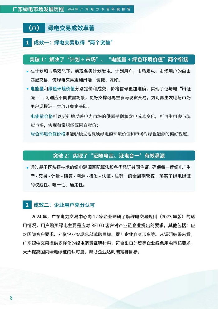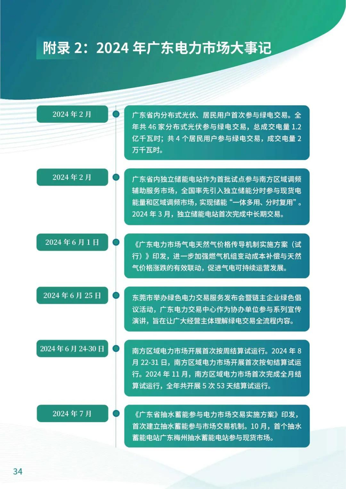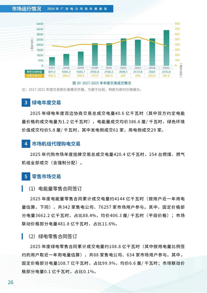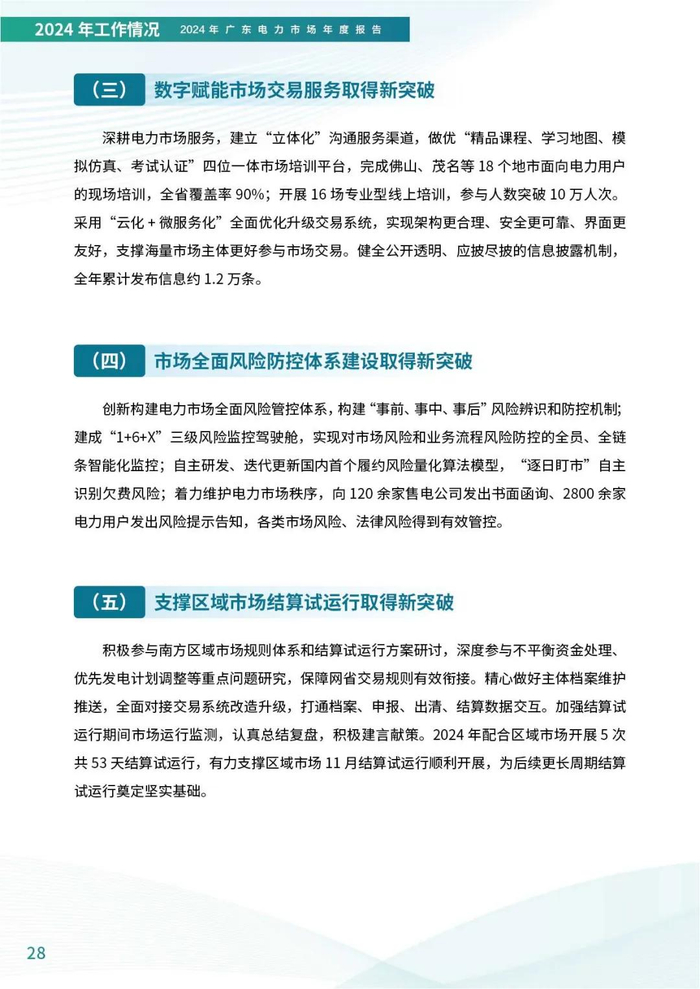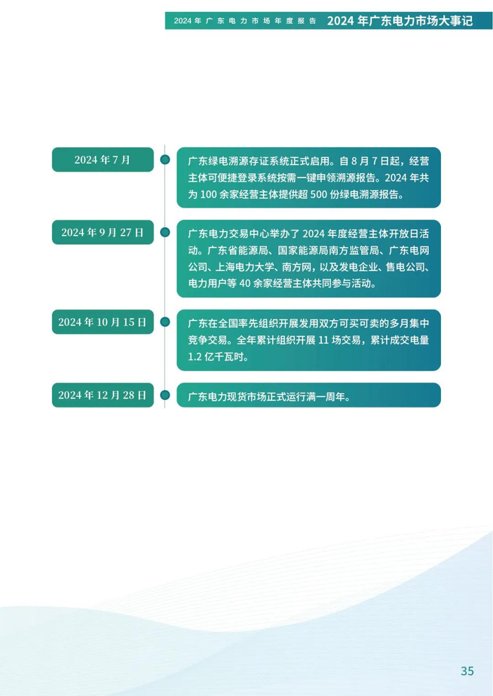 2024年,广东绿电交易量为72.6亿千瓦时。2024年2月,省内分布式光伏、居民用户首次参与绿电交易。全年共46家分布式光伏参与绿电交易,总成交电量1.2亿千瓦时,共4个居民用户参与绿电交易,成交电量2万千瓦时。