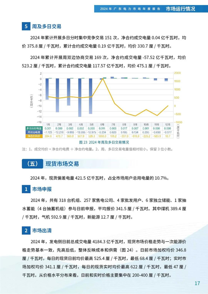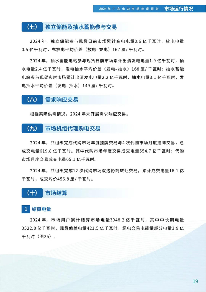 另外,报告对抽水蓄能参与广东省电力市场的情况也进行了总结,共计1家抽水蓄能参与电力现货市场,根据公开新闻,该电站为广东梅州抽水蓄能电站。2024年,抽水蓄能电站参与了广东省日前现货市场、实时现货市场: