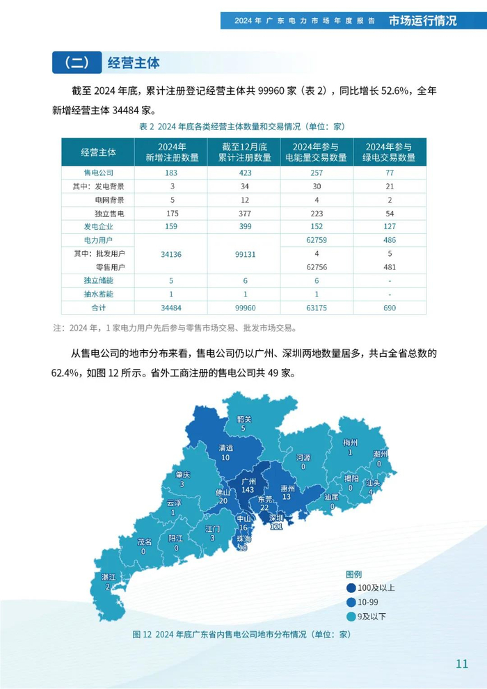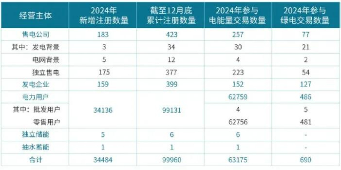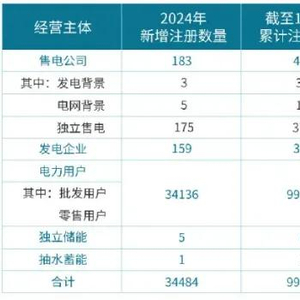 2月28日,广东电力交易中心发布《2024年广东电力市场年度报告》。截至2024年底,广东电力市场累计注册登记经营主体共99960家,同比增长52.6%,全年新增经营主体34484家。其中独立储能截止2024年12月底累计有6家注册并参与电能量交易。