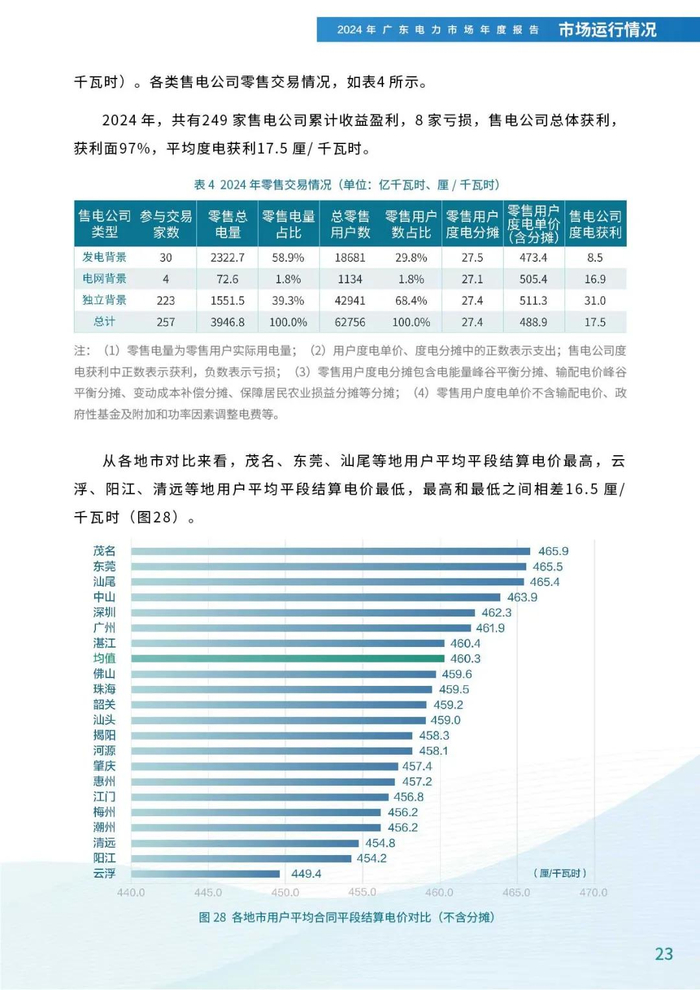广东2024年:新能源绿电0.464元/度,独立储能充放电平均价差0.167元/kWh