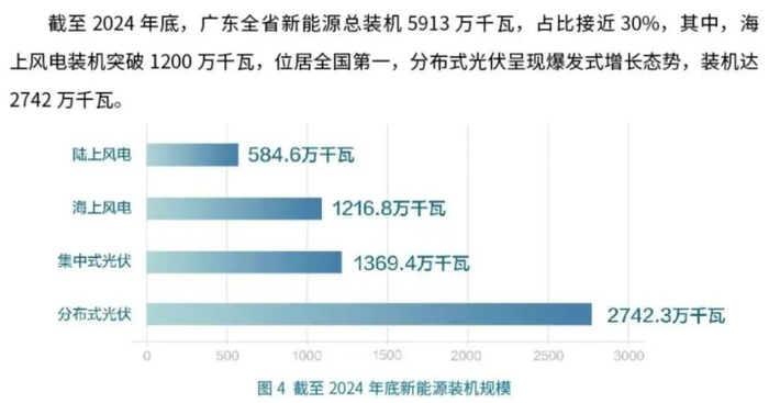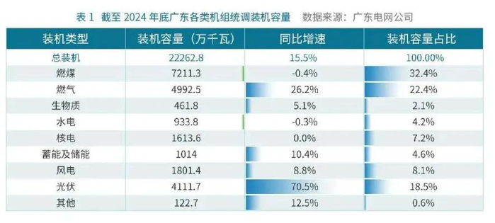 截止2024年底,广东省电力总装机2.226亿千瓦,同比增长100%。其中,风电、光伏装机分别为18GW、41.1GW,具体如下图所示。