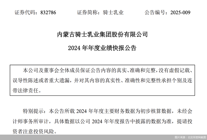 近日,骑士乳业发布2024年年度业绩快报,并修正了此前业绩预告中净利润部分,同比由盈转亏。此前2021-2023年,骑士乳业连续三个年度营收和净利润双增长,在上市后的次年,骑士乳业业绩突然变脸也是有原因的。业内分析人士指出,随着市场环境变化,奶价持续低迷,上游乳企业绩承压,骑士乳业造血能力不足的问题也凸显出来。